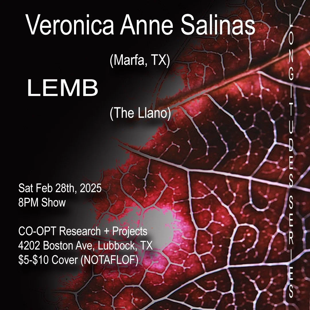 This event will be followed by a performance by Veronica Anne Salinas (Marfa, TX) and LEMB (Lubbock, TX), part of the Longitudes series.